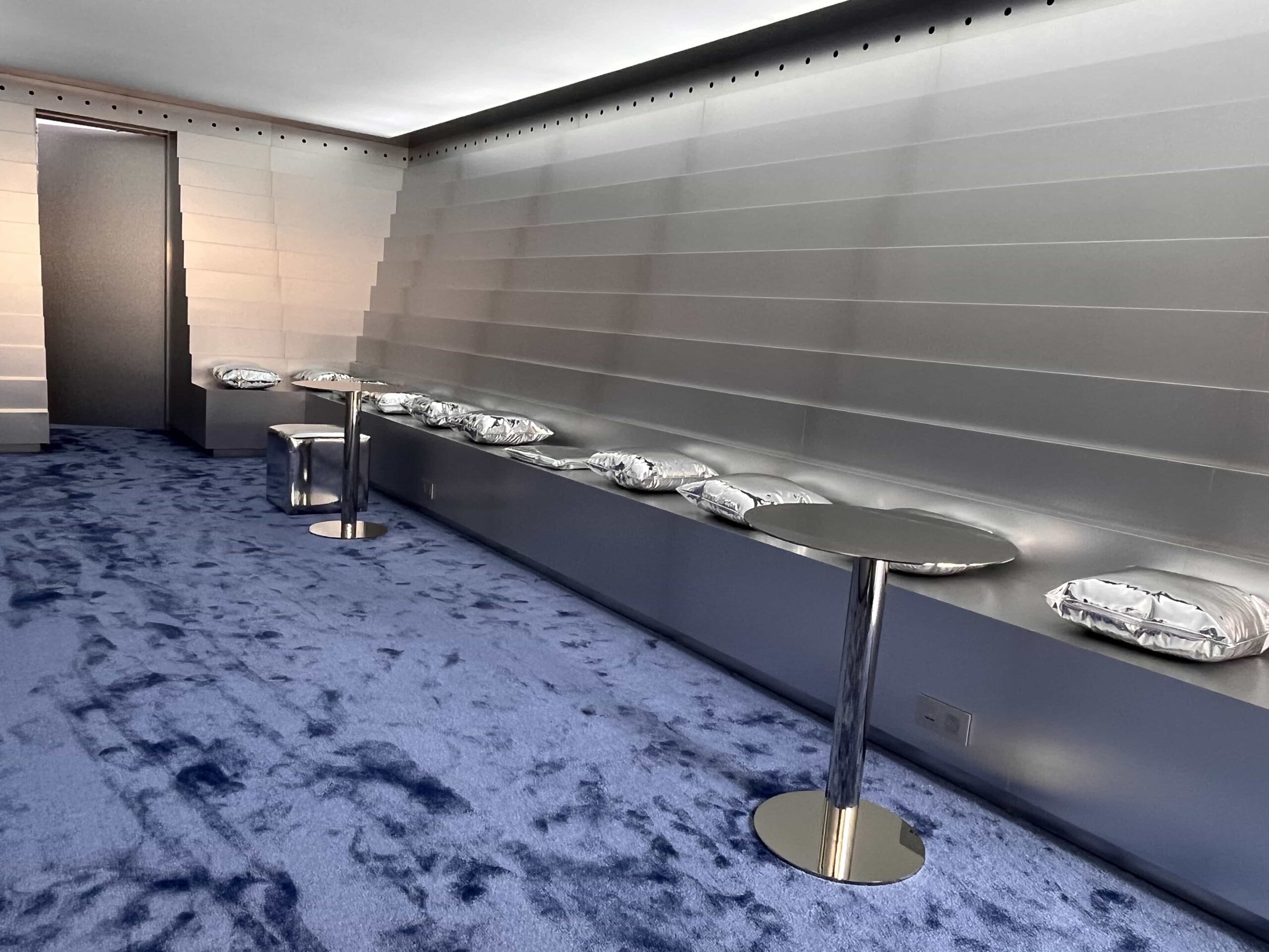 Los colores insignia de la marca, azul y cobre mezclados con el futurismo del plateado hacen un contraste perfecto con el clasicismo del Palais Royal de París.